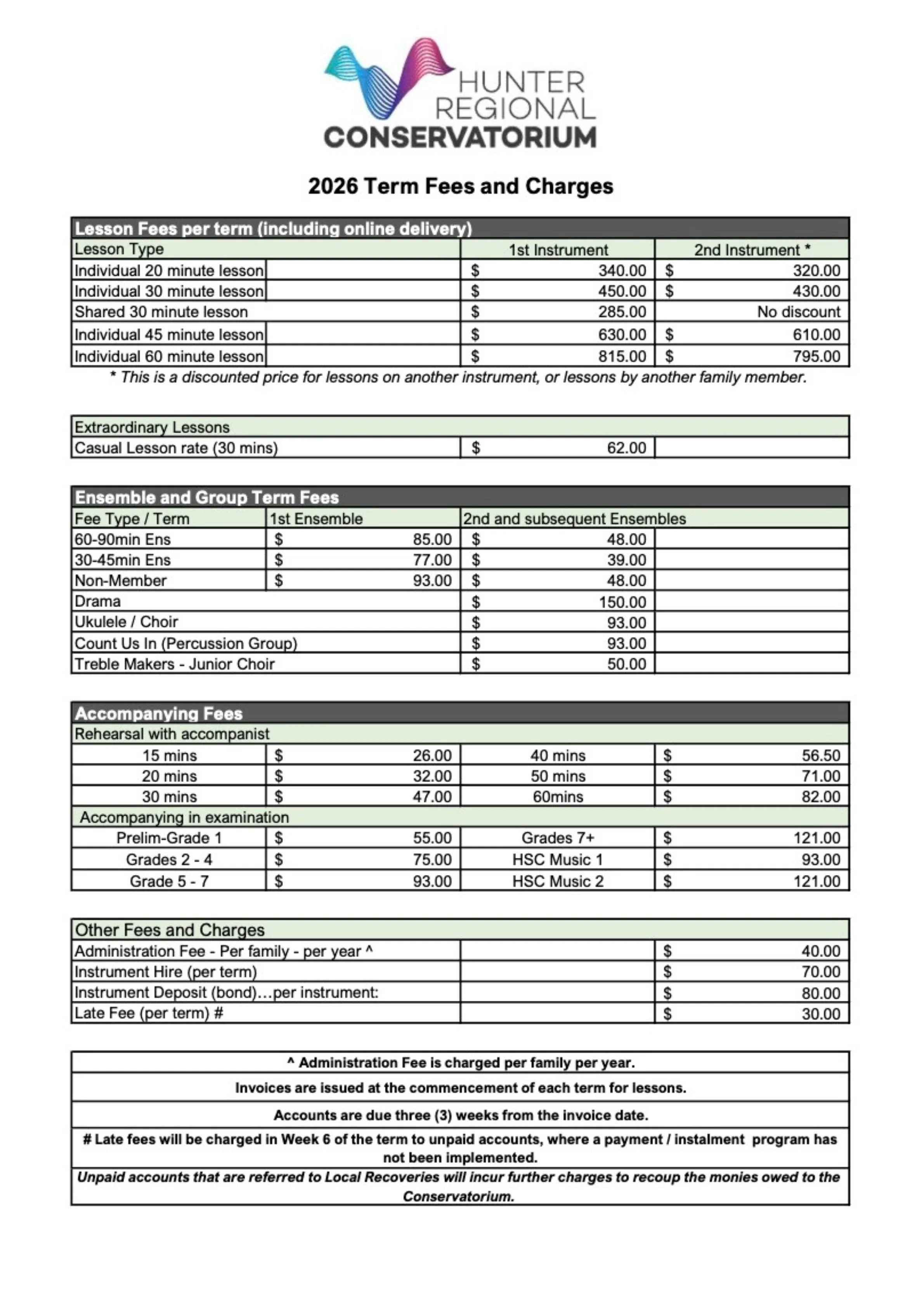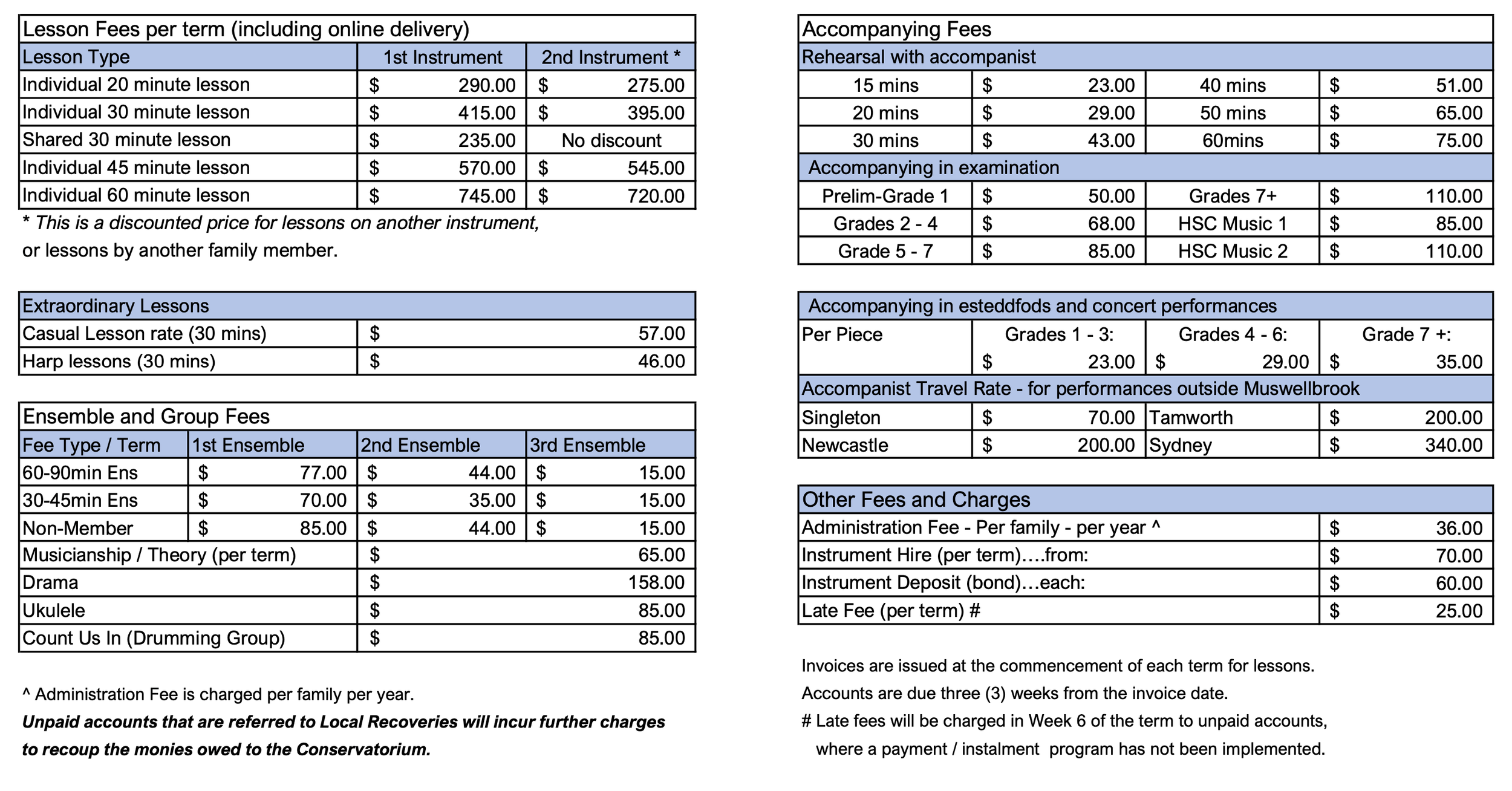 Hunter Regional Conservatorium is committed to providing high-quality, accessible musical education for all. Our fees are competitive and transparent, offering options for individual and group lessons, workshops, and ensembles. Below, you’ll find a detailed breakdown of our tuition and program costs to help you plan your musical journey.
